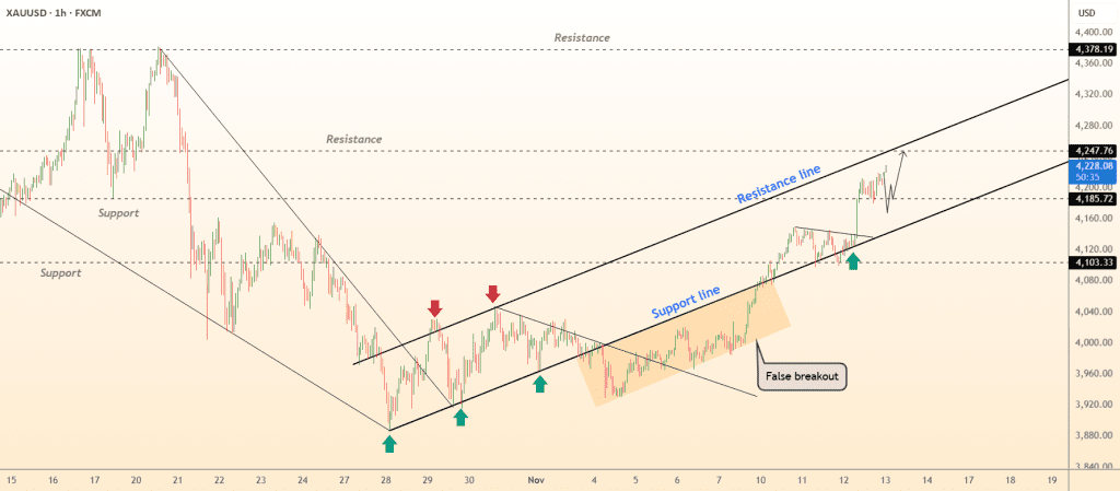 ● XAU/USD بعد از اینکه از حمایت ۴۰۴۶ دلاری برگشت و خط مقاومت نزولی رو شکست، یه روند صعودی واضح رو شروع کرده؛ کانال صعودی جدید از اوایل نوامبر نشون میده که خریدارا کنترل بازار رو دستشون گرفتن.