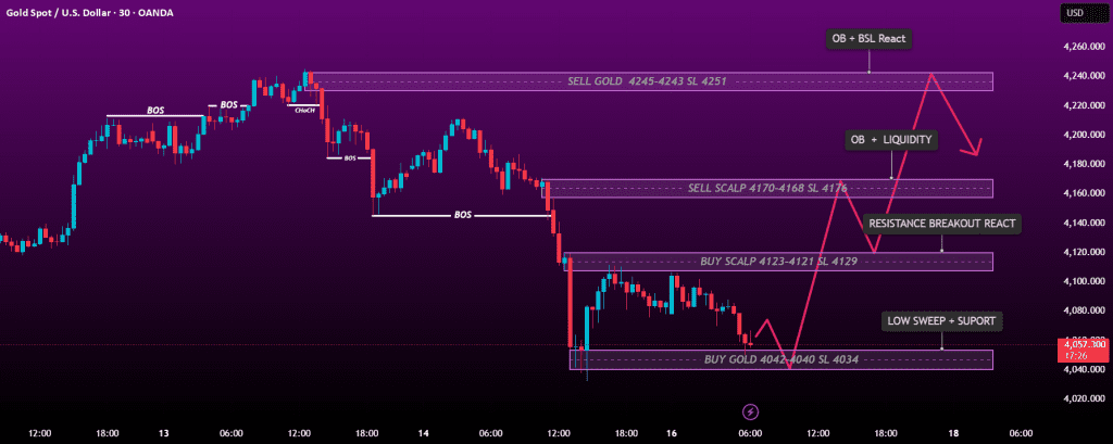 منطقه نقدینگی عمیق در ۴۰۴۲–۴۰۴۰ با FVG (Fair Value Gap) در M30 + تقاضای تایمفریم بالاتر مطابقت داره.