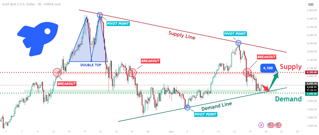 در حال حاضر، XAUUSD داره خط تقاضا رو تست میکنه که به طور مداوم در طول حرکت صعودی اخیر بهش احترام گذاشته شده. هر بار لمس این خط روند به یک نقطه پیوت بالاتر منجر شده که تایید میکنه خریداران فعال وارد بازار میشن. این منطقه با منطقه تقاضای ۴۰۰۰ تا ۴۰۱۰ دلار همخوانی داره — یک خوشه حمایتی کلیدی که قیمت قبلاً با تکانه‌های صعودی قوی بهش واکنش نشون داده.