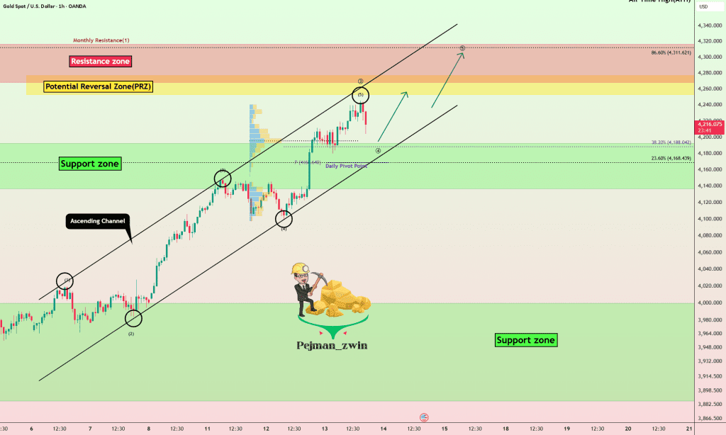 انتظار دارم طلا از محدوده حمایت (۴,۱۹۳ تا ۴,۱۳۷ دلار) تا محدوده برگشت احتمالی (PRZ) [4,277 تا ۴,۲۵۲ دلار] و محدوده مقاومت (۴,۳۱۶ تا ۴,۲۷۰ دلار) افزایش پیدا کنه.
