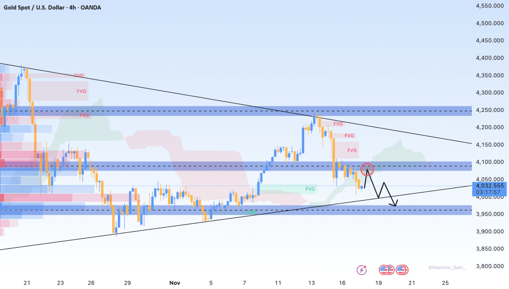 بر اساس هر دو عامل تکنیکال و کلان، حس می‌کنم این ممکنه آخرین فاز اصلاحی طلا باشه قبل از اینکه بازار دوباره تعادل خودش رو پیدا کنه. انتظار دارم قیمت به سمت ۳,۹۹۰ تا ۳,۹۷۰ دلار/اونس کاهش پیدا کنه تا نقدینگی رو «تست» کنه — منطقه‌ای که تقاضا از نظر تاریخی دوباره برمی‌گرده. اگه خریداران مثل قبل وارد بشن، طلا می‌تونه به سمت ۴,۱۰۰ تا ۴,۱۵۰ دلار/اونس برگرده، و وقتی بالای ۴,۱۵۰ رفت، هدف بعدی به سمت ۴,۲۰۰ تا ۴,۲۵۰ دلار/اونس گسترش پیدا می‌کنه.