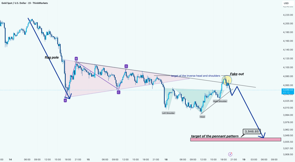 تا زمانی که طلا زیر این خط روند شکسته شده بمونه، انتظار میره که یه ریتست/رد شدن داشته باشیم، و بعدش ادامه حرکت به سمت هدف کامل الگوی پرچم (فلوگ).