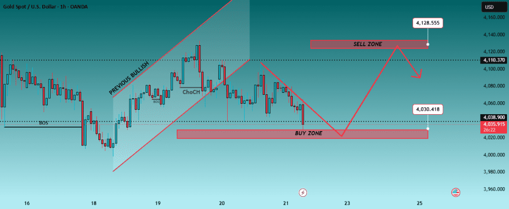 طلا یک CHoCH واضح + توالی نزولی کوتاهمدت رو کامل کرده و الان داره توی منطقه دیسکانت (discount) حدود ۴۰۳۰ فشرده میشه. - منطقه فروش پرمیوم (4H Supply):