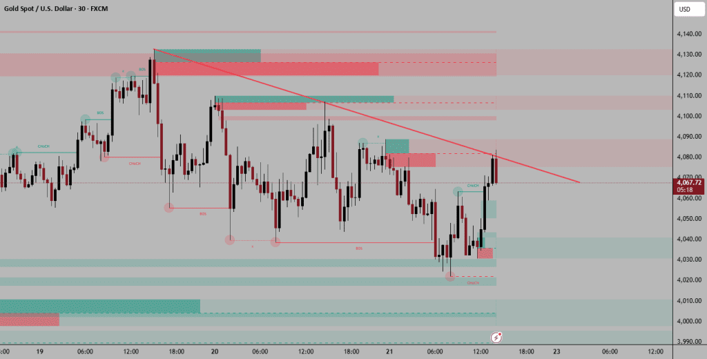 قیمت به محدوده عرضه تایم‌فریم‌های بالاتر واکنش نشون داده و به خط روند نزولی احترام گذاشته. ساختار فعلی جریان سفارش نزولی تایید شده رو با الگوهای BOS/ChoCH نشون میده. پولبک الان داره عرضه جدید رو تست می‌کنه. پایین‌تر از محدوده ۴۰۸۰، جهت‌گیری همچنان نزولیه، با اهداف نزولی در سطوح تقاضای ۴۰۴۰ و ۴۰۲۰.