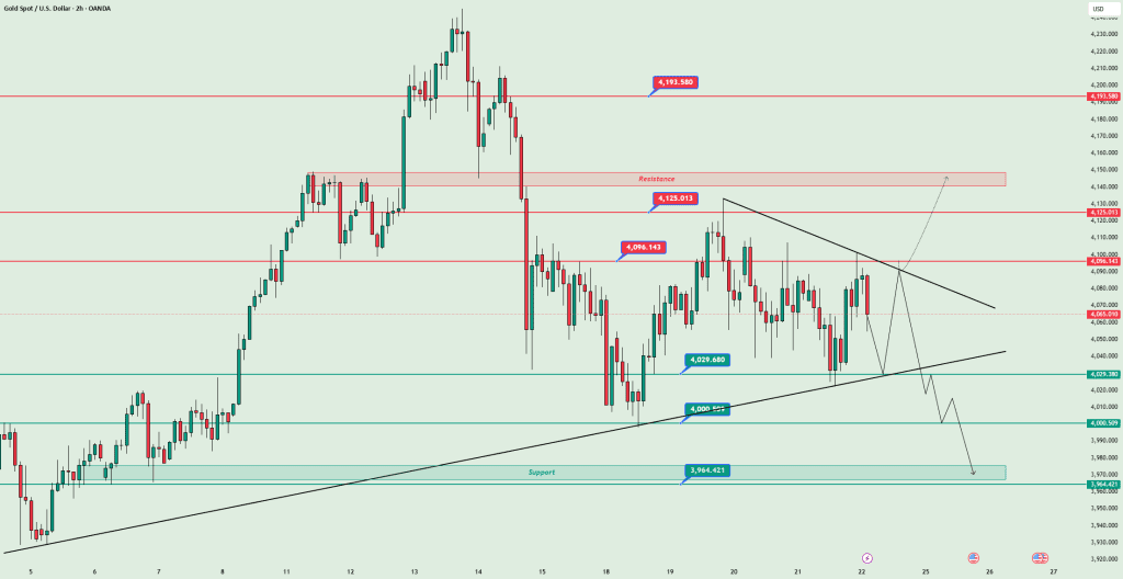 • طلا از ناحیه حمایتی ۴,۰۲۹ به شدت نوسان کرد و بعد از اون، در امتداد خط روند برگشت.