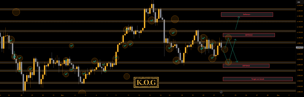 خط دفاعی باکس قرمز رو بالا و پایین اضافه کردیم، ایدهآل اینه که یه تست از اون پایین داشته باشیم، بنابراین بالا رفتن قیمت در زمان باز شدن میتونه فرصتهایی برای تلاش برای پوزیشن فروش (short) ایجاد کنه، مگر اینکه خط دفاعی شکسته بشه. در غیر این صورت، دنبال این هستیم که قیمت رو تا سطوح ۴۰۰۰-۳۹۸۰ ببریم قبل از اینکه دنبال RIPs باشیم.