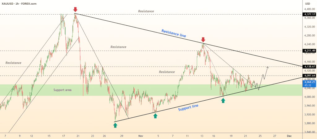 ● XAU/USD بالای محدوده حمایتی ۴۰۴۰ تا ۴۰۶۰ دلار مونده و با خط روند صعودی که کفهای بالاتر زیادی ایجاد کرده، همسو هست. این نشون میده که خریداران همچنان دارن حمایت میکنن.