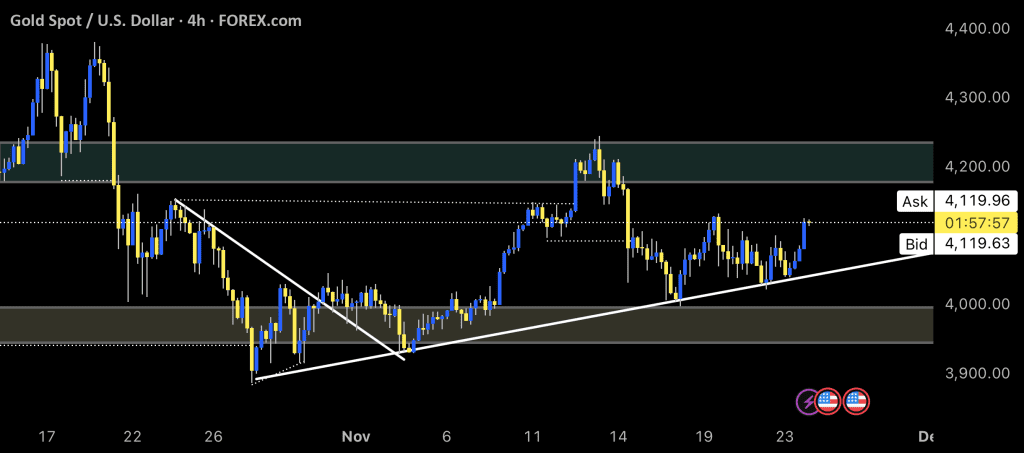 طلا توی روند صعودی بود و توی ۴۳۸۱ رد شد و تا ۳۸۸۴ افت کرد. الان جهت رو از صعودی به نزولی تغییر داده. هنوز می‌تونه تا ۴۰۵۳ افت کنه و اگه ۴۲۵۰ رو بشکنه، می‌تونه یه سقف تاریخی جدید بسازه. الان می‌تونه تقریباً ۴۰۰ تا ۵۰۰ پیپ افت کنه.