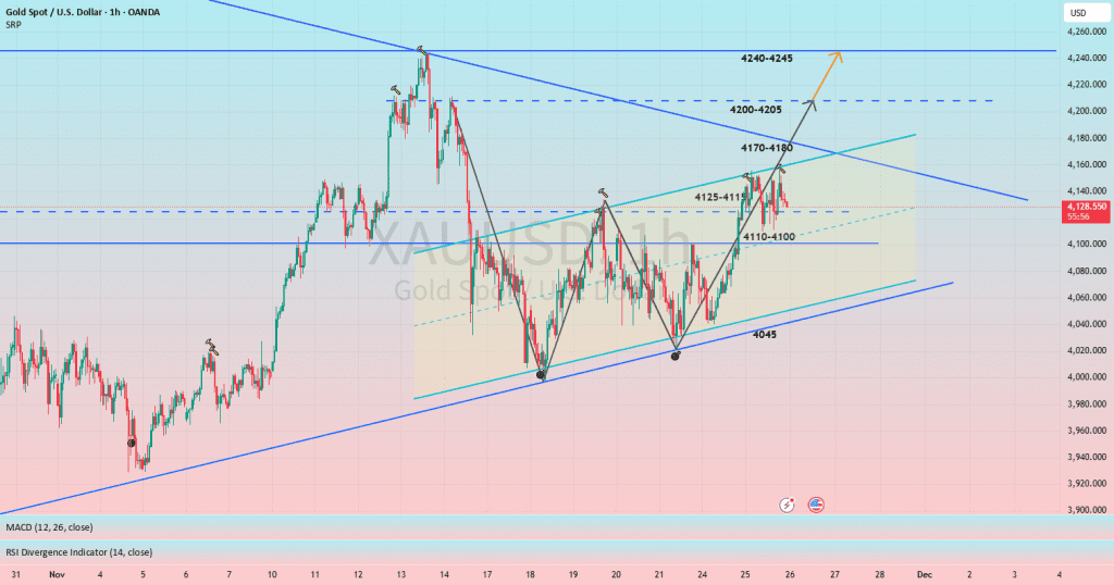 با اینکه قیمت بعد از اینکه عصر به سطح مقاومت کانال حدود ۴۱۶۰ برخورد کرد یه کم عقب‌نشینی کرد، ولی ساختار صعودی فعلی رو نشکست و بازار همچنان دست گاوها (صعودی‌ها)ست. در همین حال، تحت تاثیر عوامل مثبت زیادی مثل عدم قطعیت‌های ژئوپلیتیکی و افزایش گمانه‌زنی‌های بازار درباره کاهش نرخ بهره در دسامبر، طلا هنوز پتانسیل رشد بیشتر رو داره.
