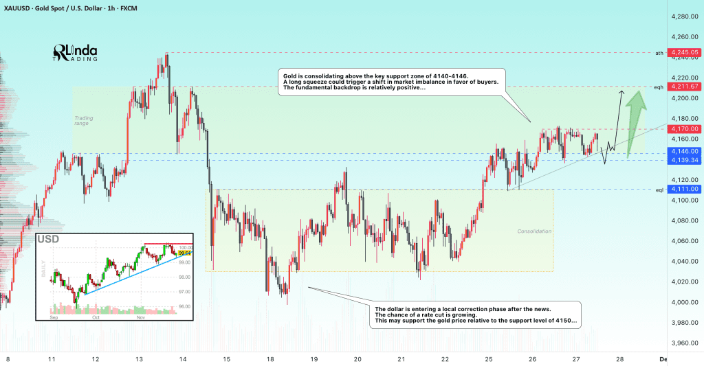 طلا بالای منطقه حمایتی کلیدی ۴۱۴۰-۴۱۴۶ در حال تحکیمه. یه لانگ اسکوییز میتونه باعث تغییر عدم تعادل بازار به نفع خریداران بشه. اگه گاوها (خریداران) قیمت رو بالای ۴۱۵۰ نگه دارن، این میتونه باعث رشد بیشتر، شکست ۴۱۷۰ و تست مجدد ۴۲۱۱ بشه.