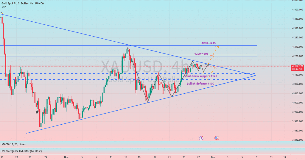 📈MA5 روزانه کوتاهمدت داره میره بالا، و میانگین متحرک ۴ ساعته و خط میانی بولینگر هم حدود ۴۱۳۵ هستن که به همراه ۴۱۲۵ پایینتر، حمایت کوتاهمدت رو تشکیل میدن. توی اولین پولبک به ناحیه ۴۱۳۵-۴۱۲۵، میشه یه پوزیشن خرید کوچیک رو در نظر گرفت. سطح حمایتی کلیدی که باید بهش توجه کرد، بدون تغییر حدود ۴۱۱۵-۴۱۰۰، نزدیک MA10 روزانه باقی میمونه. تا زمانی که این سطح حفظ بشه، روند صعودی بازار پابرجا خواهد موند.