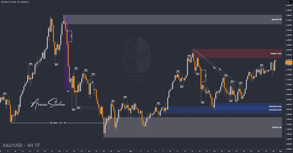 با تحلیل چارت #XAUUSD در تایم فریم ۴ ساعته، می‌تونیم ببینیم که بعد از تحلیل قبلی، طلا دقیقاً طبق انتظار حرکت کرده. حتی با نوسانات کم تو تعطیلات شکرگزاری، قیمت تونست به تارگت‌های ۴۱۹۰ و ۴۲۰۰ دلار برسه.