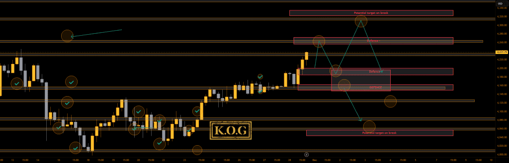 مشکلی که الان دارم اینه که اندیکاتورهای نقدینگی ما یه سقف بالاتر رو نشون میدن، اما وقتی که اون ساخته بشه، این احتمال وجود داره که ما یه برگشت شدید و یه رد شدن واضح از یکی از این سطوح مقاومت رو داشته باشیم که میتونه منجر به یه افت خیلی شدید تا دوباره اوایل ۴۰۰۰ بشه. روز اول ماه جدیده پس باید مراقب بود، ممکنه بازار با گپ باز بشه، اگه اینطور بود، بهتره دنبالش نرید، بذارید جا بیفته و بعد دنبال ستاپ باشید.
