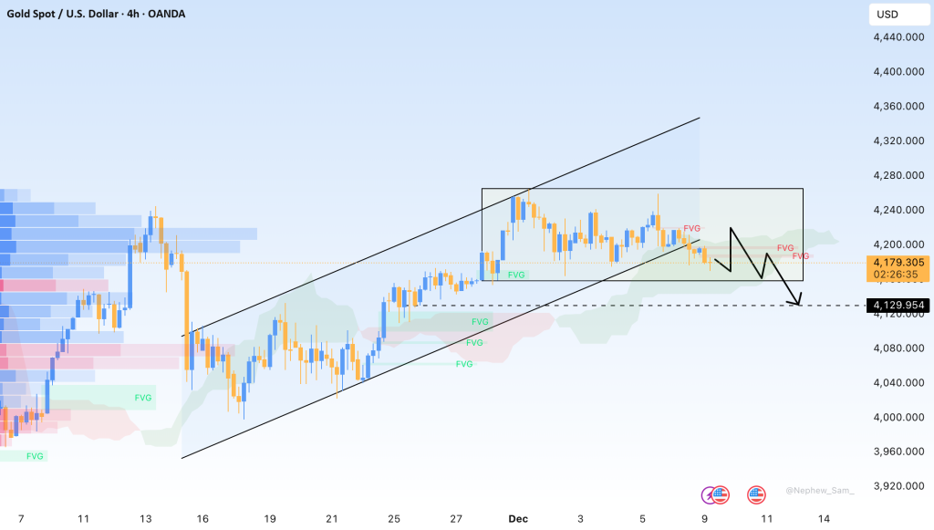 تو نمودار، بعد از اینکه طلا نتونست با موفقیت ۴,۲۲۰ دلار در هر اونس رو دوباره تست کنه، به سمت ۴,۱۸۰–۴,۱۹۰ برگشت و داره تردید آشکاری رو نشون میده. محدوده ۴,۲۱۰–۴,۲۲۰ همچنان یه سقف کوتاهمدت باقی مونده، با رد شدنهای مکرر از کندلهای بالایی که نشوندهنده ادامه فشار سودگیریه. در جهت نزولی، قیمت هنوز بالای ابر ایچیموکو و ناحیه تعادلی ۴,۱۷۰–۴,۱۸۰ قرار داره، اما اگه این ناحیه بشکنه، خطر حرکت عمیقتر به سمت ۴,۱۴۰–۴,۱۵۰ به طور قابل توجهی افزایش پیدا میکنه.