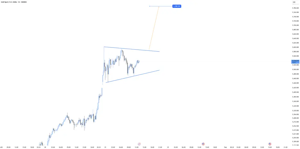 طلا الان بعد از یه رالی صعودی قدرتمند داره تثبیت می‌شه و یه مثلث انقباضی توی تایم‌فریم ۱۵ دقیقه‌ای تشکیل داده.