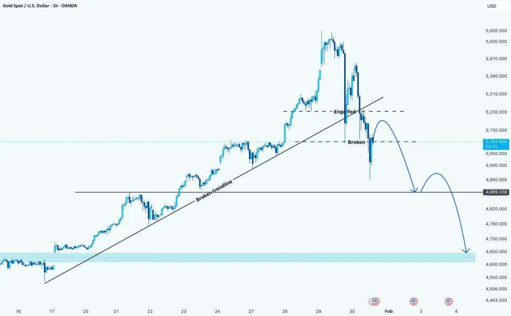 طلا وارد فاز نزولی کوتاه‌مدت شده، اونم بعد از اینکه حمایت‌های فنی کلیدی رو از دست داد. بازار خط روند صعودی رو شکست که نشونه‌ی تموم شدن روند بود، و بعدش یه واکنش کندل نزولی پوششی نزدیک مقاومت داشتیم که فشار فروش رو تایید کرد.