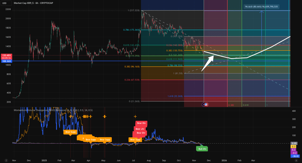 – اندیکاتور واگرایی حجم مومنتوم (MVD) روی چارت روزانه، از اواسط سال ۲۰۲۵ داره سیگنالهای مکرر حمایت خرسی (زرد) رو نشون میده و همین الان هم یکی دیگه رو چاپ کرده — از نظر تاریخی این سیگنالها در هر اصلاح بزرگ ایکسآرپی از سال ۲۰۱۷، دقیقاً کفها رو مشخص کردن.