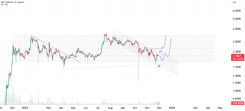 XRP داره به یک نقطه حساس تو کانال نزولیش نزدیک میشه، جایی که قیمت چندین بار کف تقاضا رو تست کرده و همچنان بالای کف ساختاری که با X قرمز مشخص شده، خودش رو نگه داشته. این ناحیه به عنوان یک گودال نقدینگی اصلی عمل کرده و بازار داره نشانههای اولیه جذب رو نشون میده تا ادامه حرکت به سمت پایین.