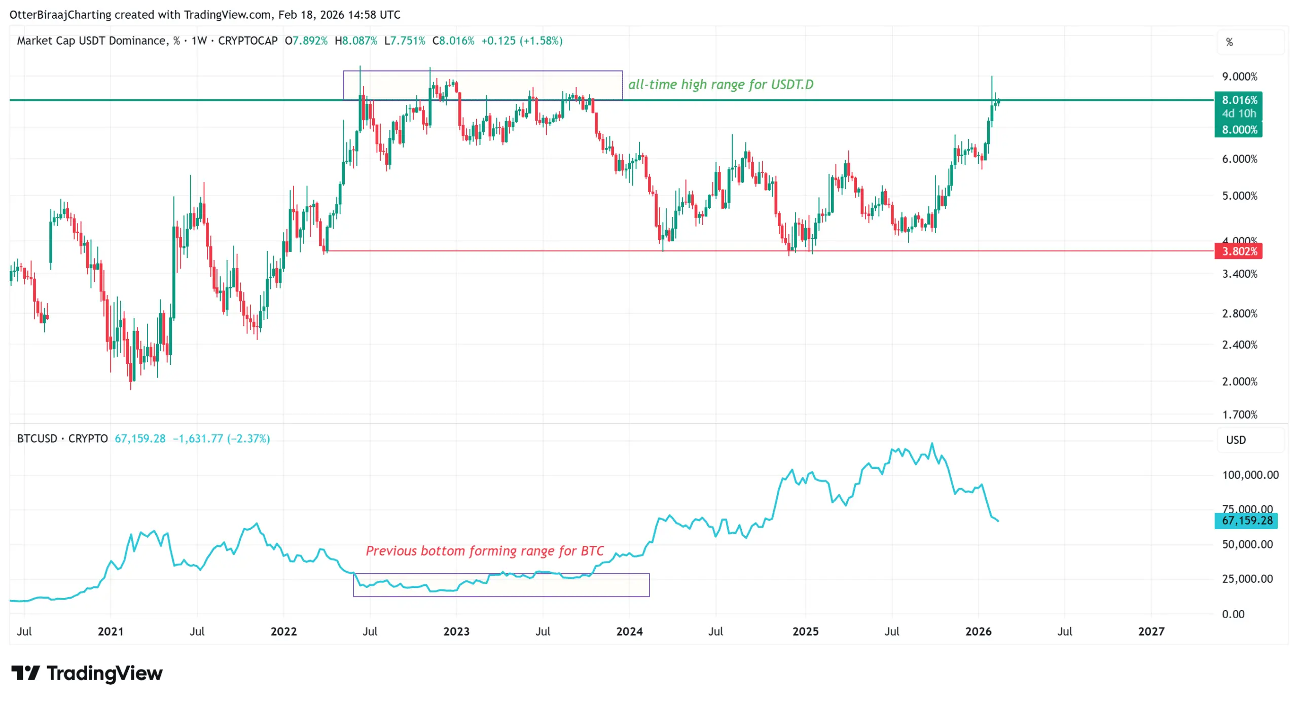 پیش از این، نمودار دامیننس USDT در مارس ۲۰۲۴، دسامبر ۲۰۲۴ و اکتبر ۲۰۲۵، پایینترین سطوح خود را در حدود ۳.۸ تا ۴ درصد تشکیل داد. این دورهها با ثبت بالاترین رکوردهای جدید بیت کوین در نزدیکی ۷۲٬۰۰۰ دلار، ۱۰۴٬۰۰۰ دلار و ۱۲۶٬۰۰۰ دلار همزمان بودند.