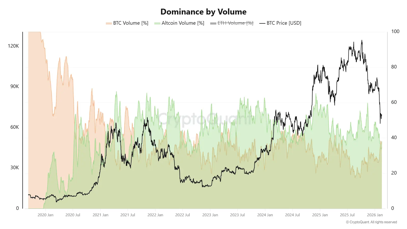 دادههای بایننس هم این تغییر را تقویت میکند. در اوایل فوریه (بهمن) یعنی زمانی که BTC سطح ۶۰٬۰۰۰ دلار را آزمایش کرد، حجم کل معاملات بازتوزیع شد. در ۷ فوریه، حجم بیت کوین به ۳۶.۸ درصد از کل فعالیتها افزایش یافت. حجم آلت کوینها تا اواسط فوریه به ۳۳.۶ درصد کاهش یافت، در حالی که در نوامبر به ۵۹.۲ درصد رسیده بود.