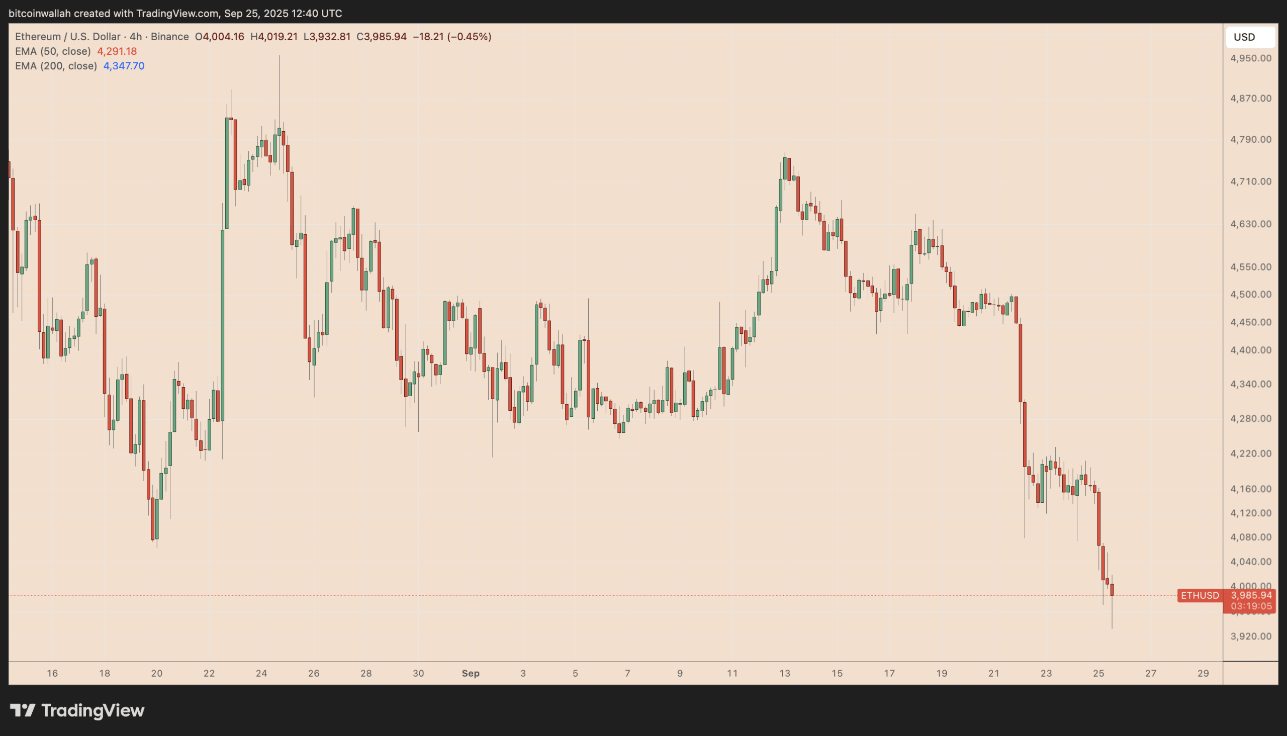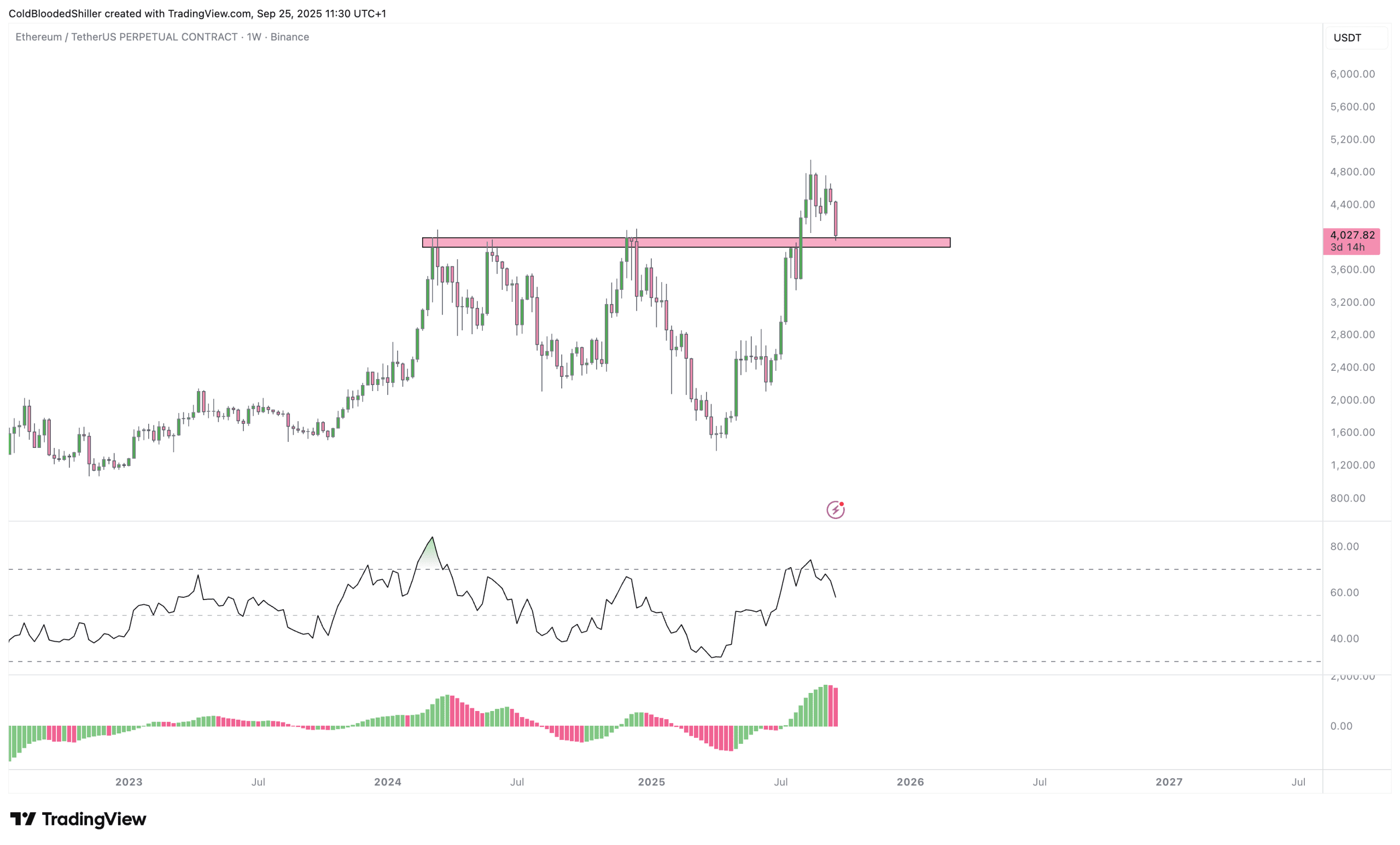 در همین حال، نمودار هفتگی اتریوم نشان میدهد قیمت در حال آزمون دوباره یک ناحیه حمایتی افقی کلیدی حوالی ۳٬۸۰۰ تا ۴٬۰۰۰ دلار است.