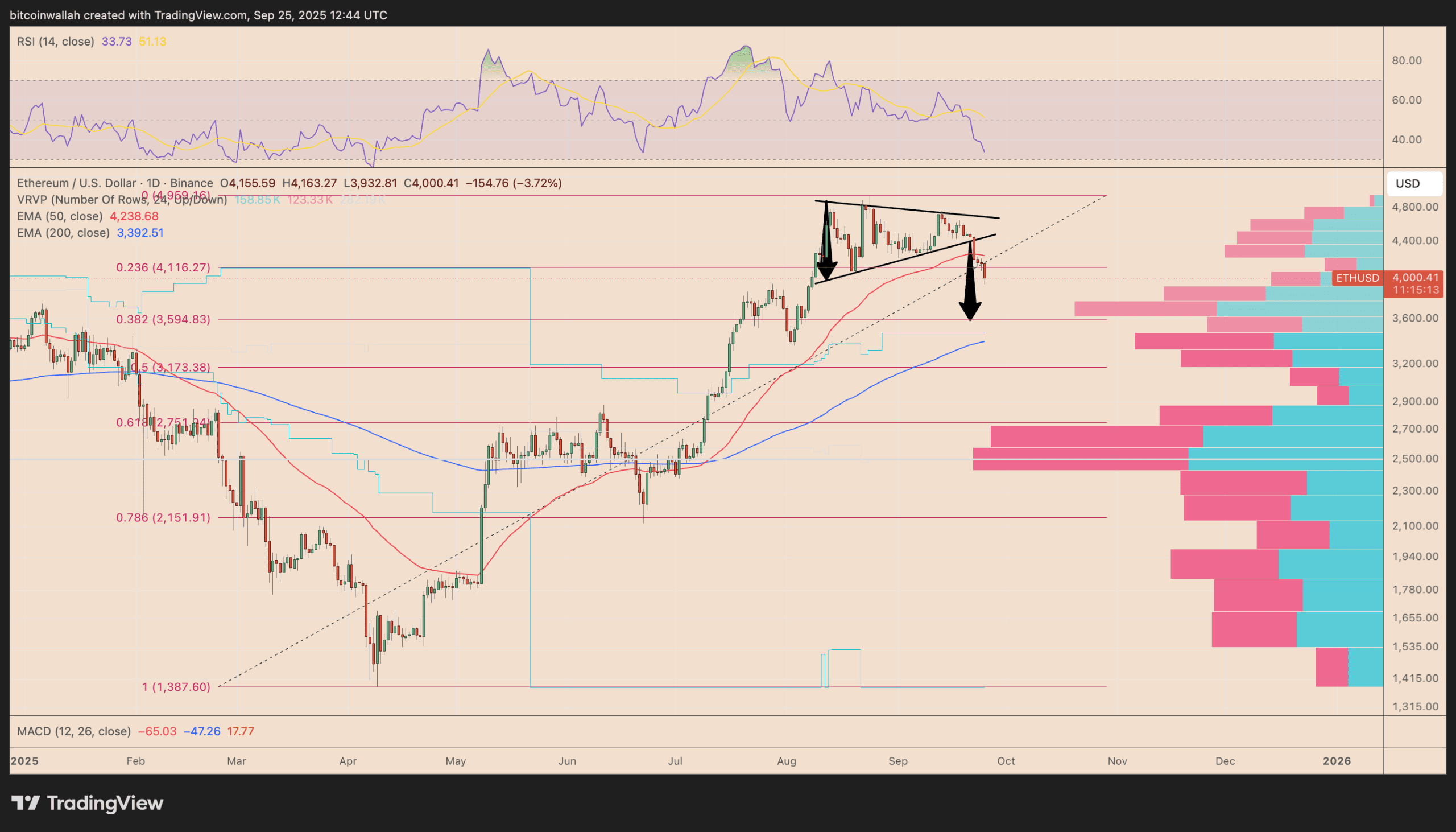 اتریوم شکست نزولی از یک الگوی مثلث متقارن را در نمودار روزانه تایید کرده است. الگویی که معمولاً اگر پس از یک روند صعودی قدرتمند رخ دهد، نشاندهنده بازگشت نزولی است. این حرکت سوگیری کوتاهمدت را به سمت نزول منتقل میکند و هدف بعدی را نزدیک سطح اصلاحی فیبوناچی ۰.۳۸۲ در ۳٬۵۹۵ دلار قرار میدهد که در کوتاهمدت حدود ۱۰ درصد پایینتر از سطوح فعلی است.