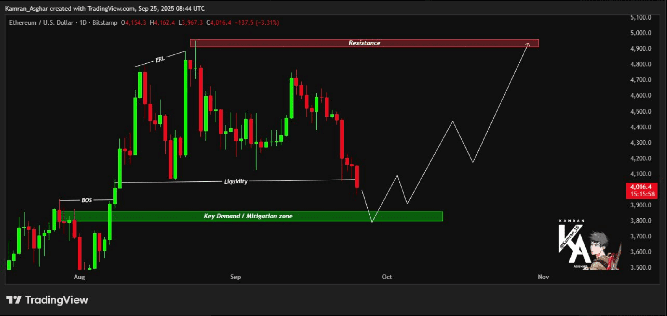 کامران اذغار، تحلیلگر مطرح بازار، محدوده ۳٬۶۰۰ دلار را بهعنوان «منطقه تقاضای کلیدی» برجسته کرد. او ادعا کرد ETH ممکن است برای هدفگیری ۴٬۹۰۰ دلار یا بالاتر رشد کند.