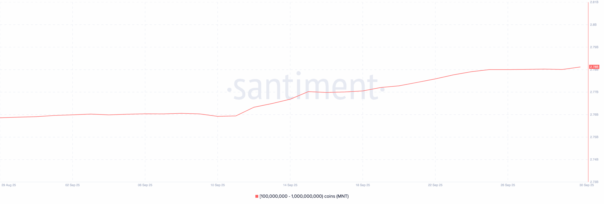 در حالی که توجه بازار بیشتر روی WLD و PUMP است، منتل بی‌سروصدا توجه نهنگ‌های بزرگ را جلب کرده است. کیف‌ پول‌هایی که بین ۱۰۰ میلیون تا ۱ میلیارد MNT دارند، اکنون ۲.۷۸ میلیارد توکن را در اختیار گرفته‌اند. این افزایش چشمگیر، جایگاه منتل به‌عنوان یک راهکار لایه‌ ۲ معتبر را تقویت می‌کند.