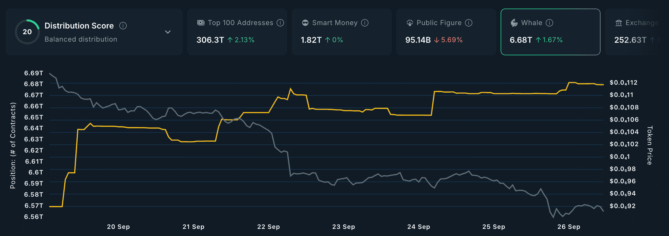 طبق گزارش Nansen، سرمایهگذاران بزرگی که بیش از ۱ میلیون دلار PEPE در اختیار دارند، ذخایر خود را ۱.۳۶ درصد افزایش دادهاند و از ضعف کلی بازار برای افزایش موقعیتهایشان استفاده کردهاند. این روند نشاندهنده اعتماد بیشتر سرمایهگذاران ثروتمند است که افت اخیر بازار را یک نقطه ورود استراتژیک میبینند.