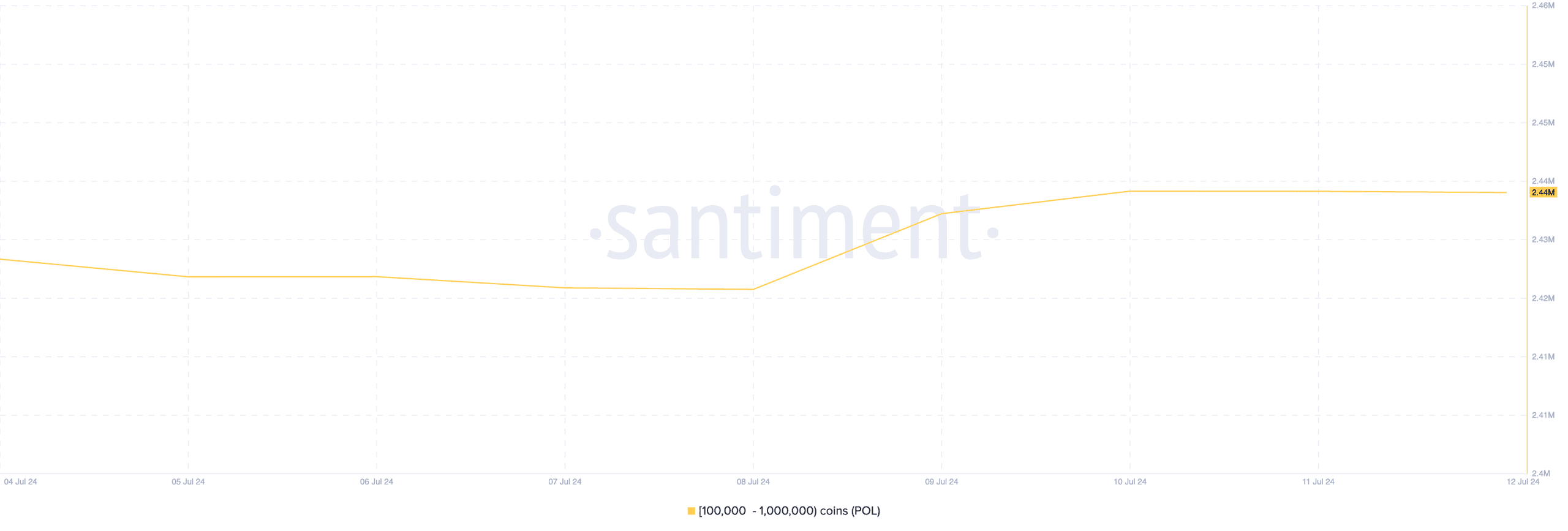 قیمت پالیگان طی هفت روز گذشته ۱۶ درصد کاهش یافته است. در همین بازه، آدرسهای بزرگ با ذخایر بین ۱۰۰٬۰۰۰ تا ۱ میلیون توکن، در حال انباشت این آلت کوین هستند و از سطوح پایین بهرهبرداری میکنند. طبق دادههای Santiment، این گروه از سرمایهگذاران طی هفته گذشته ۲۲۰٬۰۰۰ توکن POL به ذخایر خود افزودهاند.