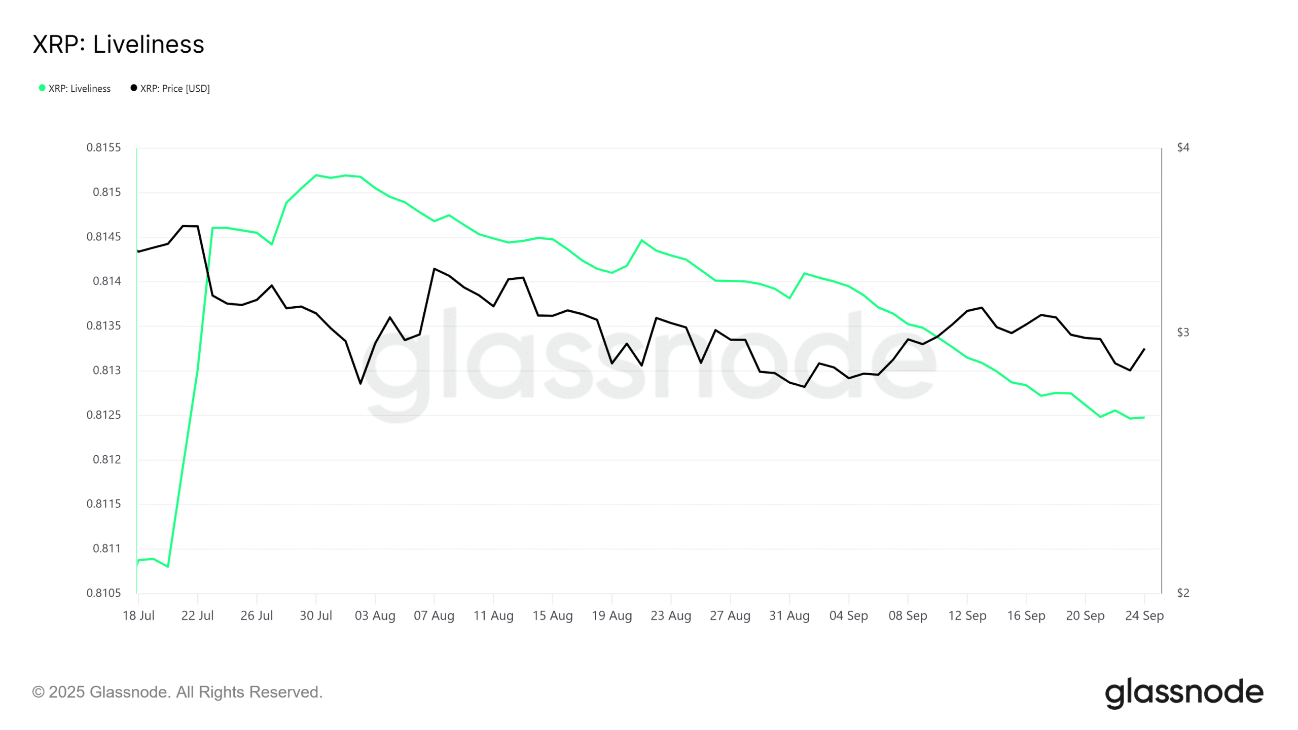 شاخص Liveliness روندهای دلگرمکنندهای را برای XRP نشان میدهد. این شاخص طی دو هفته گذشته کاهش پایداری داشته است. شاخص مذکور در حال حاضر در پایینترین سطح دو ماه اخیر خود قرار دارد و نشان میدهد که حرکت عرضه از سوی LTHها به طور قابل توجهی کند شده است. این امر حاکی از نگهداری یا انباشت به جای فروش گسترده است. این رفتار نشاندهنده اطمینان در میان سرمایهگذاران بلندمدت است که معمولا تأثیر زیادی بر مسیر XRP داشتهاند.