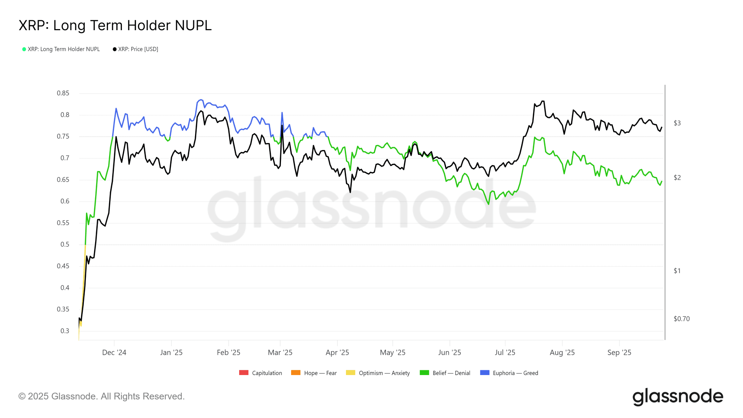 معمولاً فروش LTH تنها زمانی تشدید میشود که NUPL از ۰.۷ عبور کند. فشار قویتر نیز باعث عبور این شاخص از مرز ۰.۷۵ خواهد شد. از آنجایی که XRP به این آستانهها نرسیده، این توکن هنوز فضای کافی برای رشد اصلی دارد.