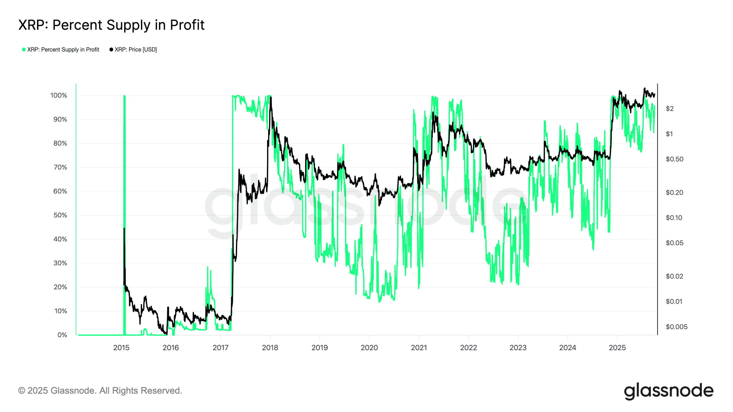 داده‌های آنچین نشان می‌دهد که آخرین رالی XRP، فشار فروش شدیدی را که در اوج‌های بازار گاوی گذشته مشاهده می‌شد، ایجاد نکرده است. طبق داده‌های Glassnode، درصد عرضه در سود (سهم XRP در گردش که بالاتر از قیمت تمام‌شده آن معامله می‌شود) نسبتاً پایدار باقی مانده است.