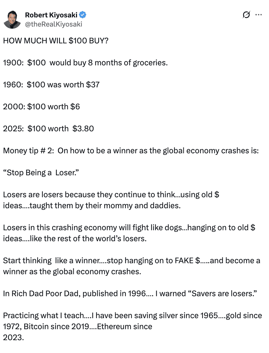 نویسنده کتاب پدر پولدار، پدر بی‌پول که سال ۱۹۹۶ هشدار داد «پس‌اندازکنندگان بازنده‌اند»، می‌گوید خودش از دهه ۶۰ میلادی به‌جای پس‌انداز پول، روی نقره، طلا، بیت کوین و اتریوم سرمایه‌گذاری کرده است. او مثال می‌زند که خانه ۴.۵ میلیون دلاری‌اش را با ۴۵۰٬۰۰۰ دلار طلا که در سال ۲۰۰۰ خریده‌ بود، پرداخت کرده است.