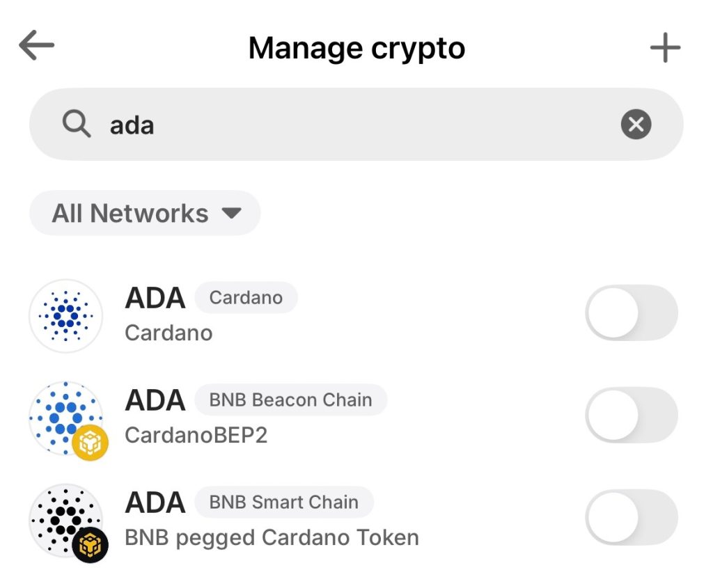 آلت عکس: توکن ADA روی شبکه اصلی کاردانو (اولی)، روی شبکه بایننس چین (دومی) و روی بایننس اسمارت چین (سومی) در تراست ولت
