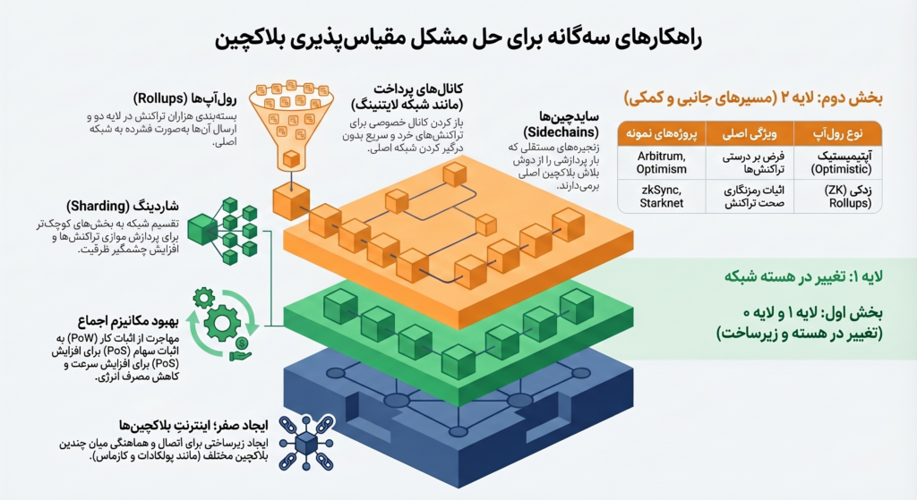 راه‌حل‌های مقیاس‌پذیری معمولاً در سه سطح بررسی می‌شوند: لایه یک (Layer 1)، لایه دو (Layer 2) و لایه صفر (Layer 0). هرکدام از این لایه‌ها از زاویه‌ای متفاوت به مسئله نگاه می‌کنند؛ لایه یک مستقیماً خود بلاکچین را تغییر می‌دهد، لایه دو بار پردازش را از دوش شبکه اصلی برمی‌دارد و لایه صفر زیرساختی می‌سازد که ارتباط و هماهنگی میان شبکه‌های مختلف را آسان‌تر می‌کند.
