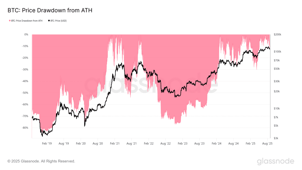 با اصلاح اخیر بیت کوین تا سطح ۱۱۰.۱ هزار دلار، دراوداون یا افت قیمت آن نسبت به اوج تاریخی ۱۲۴ هزار دلار به حدود ۱۱.۴٪ رسید. این دراوداون در مقایسه با اصلاحهای بینچرخهای قبل که معمولاً بیش از ۲۵٪ بودهاند، یا در مقایسه با کفهای چرخههای گذشته بیت کوین که در آنها قیمت بیش از ۷۵٪ اصلاح میشد، بسیار ملایمتر است. بنابراین، شدت اصلاح فعلی بیت کوین هنوز سطحی است و در حد اصلاحهای شدیدی که در نقاط حساس چرخههای گذشته بیت کوین دیده شده بود، نیست.