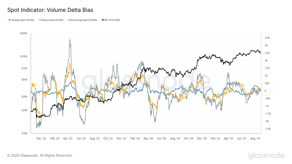 برای شناسایی تغییرات رفتار سرمایهگذاران بازار اسپات، میانگین متحرک ۳۰ روزه شاخص CVD را با میانگین ۱۸۰ روزه آن مقایسه میکنیم. در صرافیهای بزرگ مانند کوین بیس (Coinbase) و بایننس (Binance) و همچنین جریان سرمایه کل صرافیها، این نسبت اخیر به صفر همگرا شده است. این یعنی فشار خرید قوی مشاهدهشده در آوریل ۲۰۲۵ که باعث برگشت قیمت از کف ۷۲ هزار دلار شده بود، تقریبا از بین رفته است. با اینکه یک تکانه مثبت کوچک در ماه جولای باعث رشد قیمت بیت کوین تا محدوده ۱۲۴ هزار دلار شد، روند کلی بیت کوین نشان میدهد که در حال حاضر احساسات بازار اسپات خنثی است و خریداران اطمینان کافی به بازار ندارند.