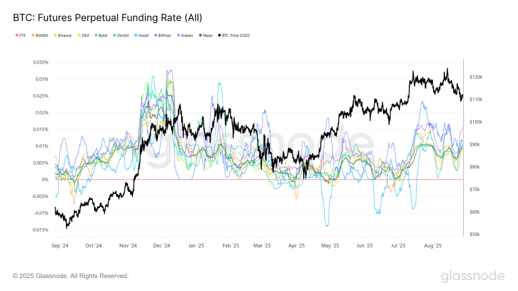 برای تایید احساسات کلی در بازار دائمی بیت کوین میتوانیم دادههای CVD را با شاخص فاندینگ ریت (Funding Rate) این بازار ترکیب کنیم. این شاخص هزینه نگهداری موقعیتهای لانگ و شورت را باهم مقایسه میکند. میانگین متحرک ۷ روزه فاندینگ ریت در صرافیهای بزرگ حدودا به ۰.۰۱٪ رسیده است، البته در برخی صرافیها جهشهای موقت به بالای این سطح نیز داشته است.