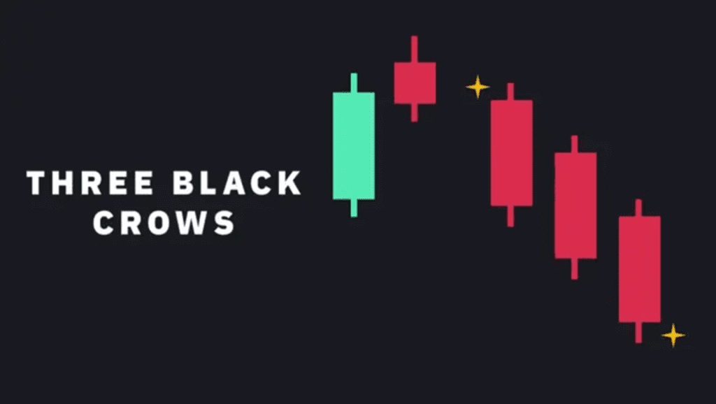 الگوی سه کلاغ سیاه از سه شمع قرمز متوالی ساختهشده است که هر یک از آنها در راستای بدنه شمع قبلی باز یا آغاز میشوند و در سطحی پایینتر از سطح شمع قبلی بسته میشوند.