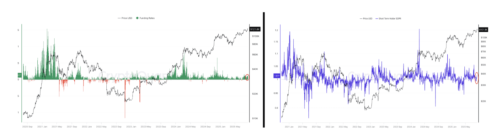 شاخصهایی مانند نرخ تامین مالی (Funding Rate) و جریان ورود سرمایه کوتاهمدت، همچنان نسبت به سقفهای قبلی در سطوح پایینی قرار دارند و برداشت سود توسط سرمایهگذاران کوتاهمدت محدود بوده است (بر اساس دادههای CryptoQuant).