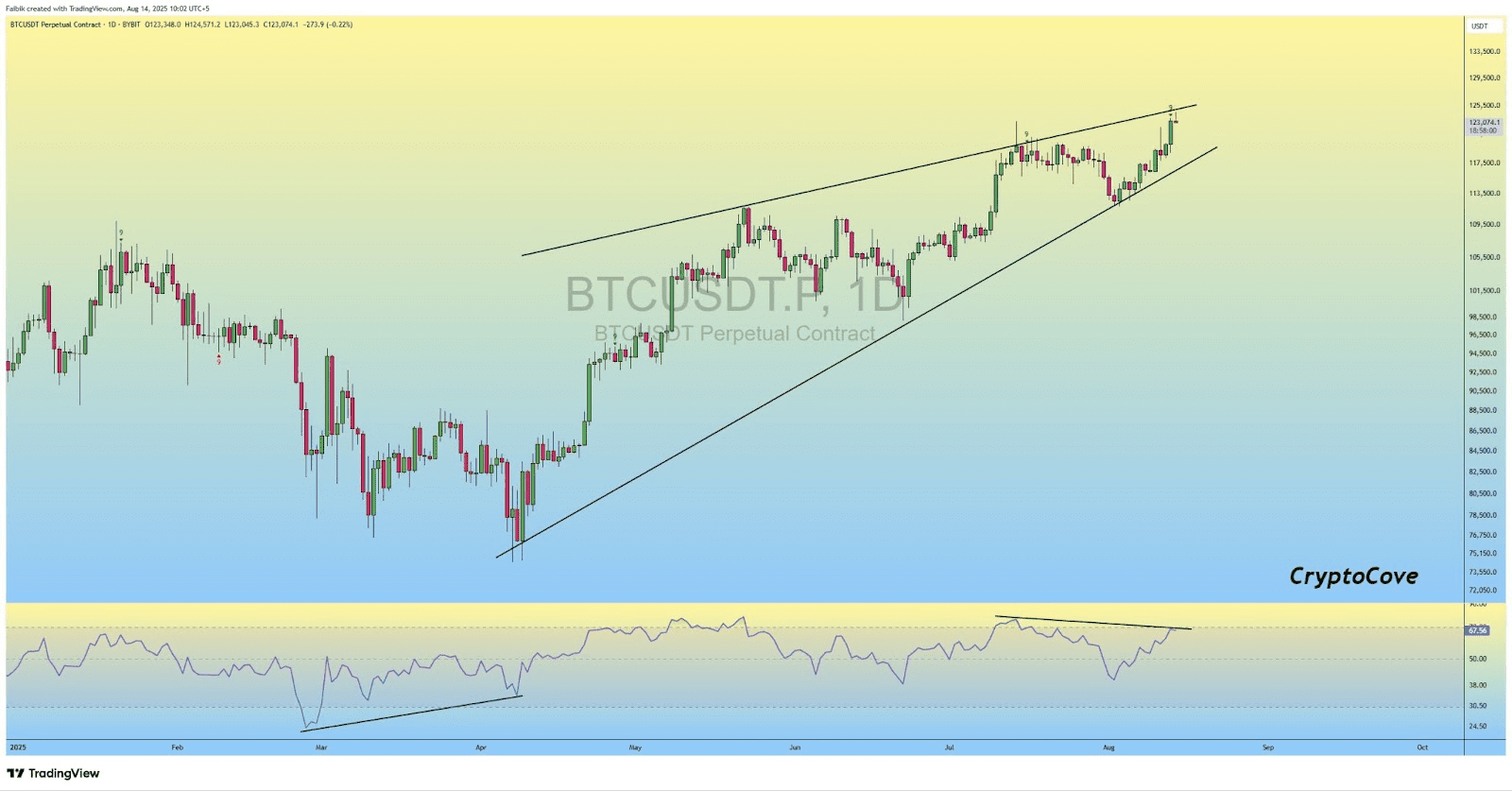 پس از جمعآوری نقدینگی در مسیر رسیدن به اوج تاریخی، BTC چند سیگنال نزولی نشان داده است، از جمله ظاهر شدن «کندل فروش شماره ۹ TD» در نمودار روزانه. واگرایی نزولی RSI روزانه نشان از کاهش مومنتوم دارد و تشکیل الگوی کنج صعودی (Rising Wedge) حاکی از کاهش فشار خرید است که معمولاً پیش از افت قیمت دیده میشود.