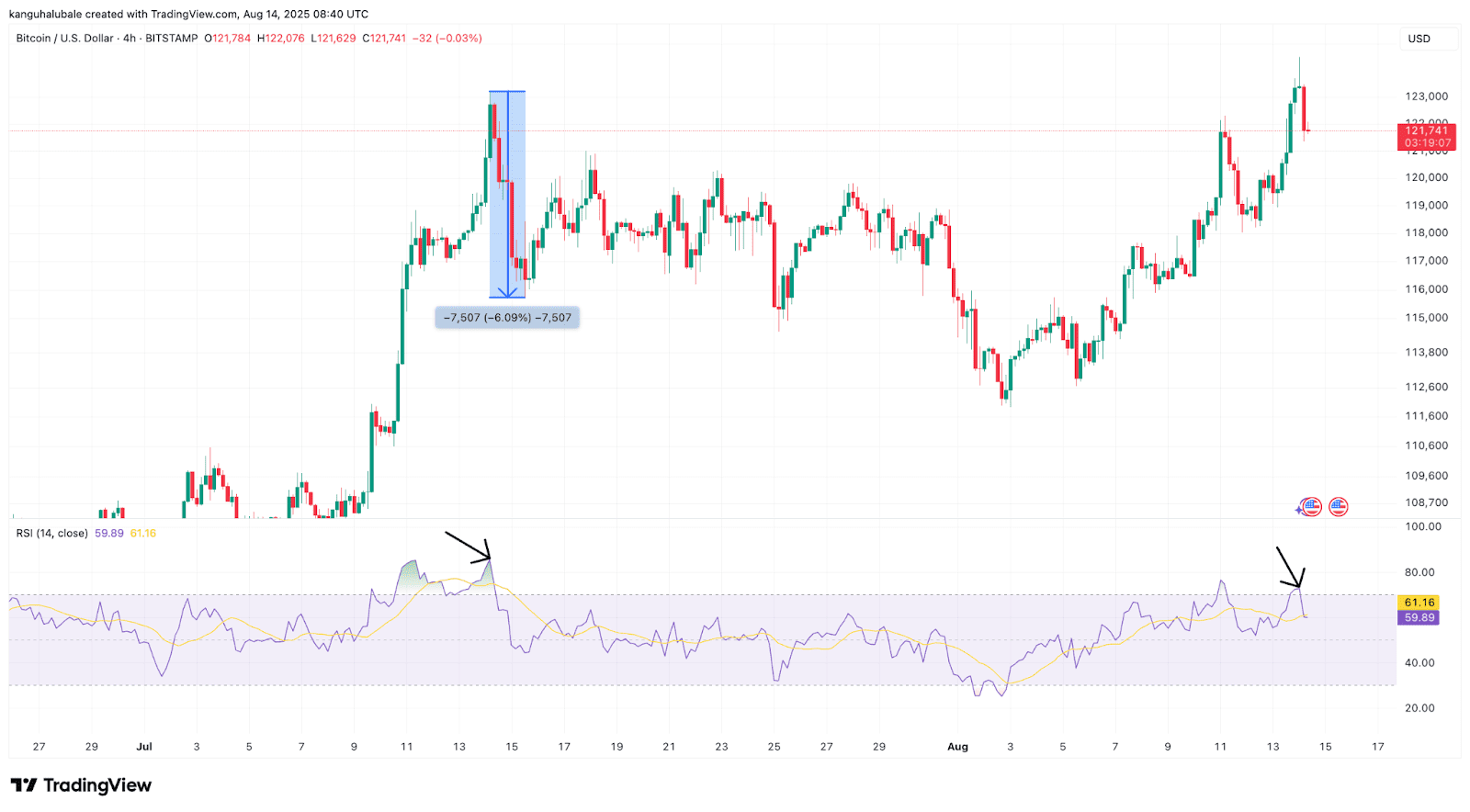 اصلاح از ۱۲۴٬۰۰۰ دلار تا ۱۲۱٬۰۰۰ دلار پس از ورود به محدوده اشباع خرید رخ داد. شرایط اشباع خرید پیشین، مثلاً در اوج ۱۲۳٬۰۰۰ دلاری ماه جولای (تیر)، نیز باعث اصلاح ۶ درصدی تا ۱۱۵٬۰۰۰ دلار شده بود.