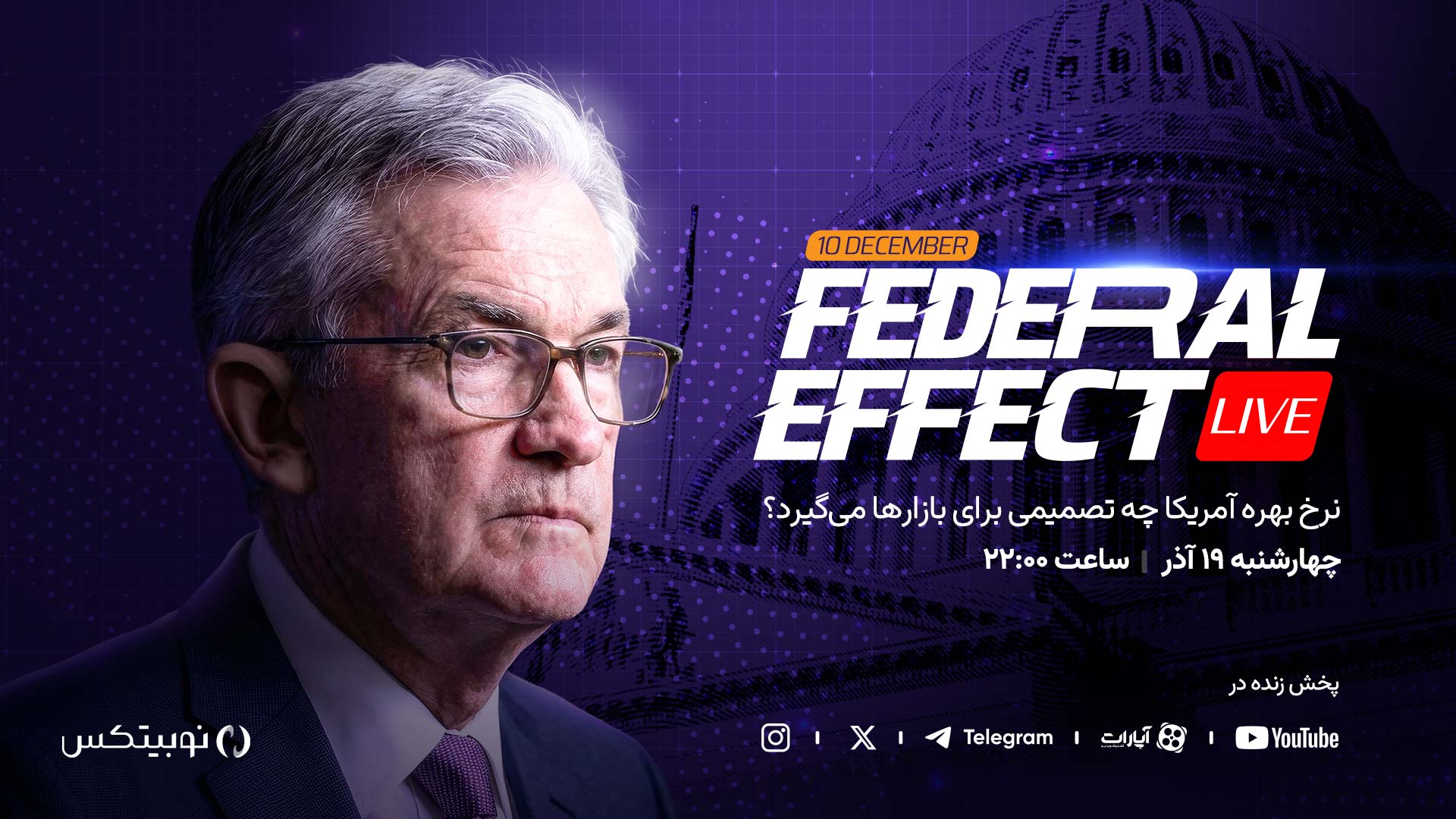 نرخ بهره فدرال رزرو روز چهارشنبه ۱۹ آذر ۱۴۰۴ مصادف با ۱۰ دسامبر ۲۰۲۵ رأس ساعت ۲۱:۳۰ اعلام خواهد شد. در برنامه فدرال افکت نوبیتکس میتوانید بهصورت زنده از نرخ بهره جدید آمریکا و اخبار و حواشی مرتبط با آن مطلع شوید. بعد از اعلام نره بهره نیز واکنش بازار به نرخ بهره جدید بررسی خواهد شد.