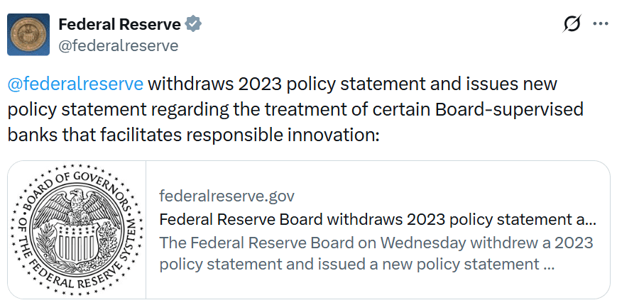 این اقدام در روز چهارشنبه در حالی صورت گرفت که فدرال رزرو راهنمایی جدیدی را صادر کرد تا مسیری رسمی برای بانکهای عضو ایالتی تحت نظارت فدرال رزرو، هم بیمهشده و هم بدون بیمه، برای پیگیری «فعالیتهای نوآورانه» مانند رمزارزها، فراهم کند، مشروط بر اینکه انتظارات مدیریت ریسک برآورده شوند، این بر اساس بیانیه روز چهارشنبه فدرال رزرو است.