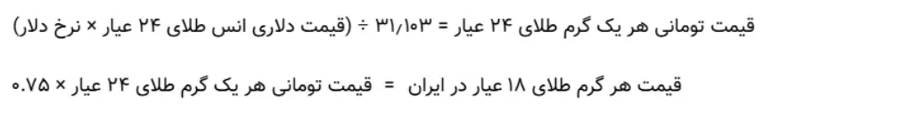 برای این محاسبه، باید قیمت دلاری اونس را در نرخ ارز ضرب کرده، بر ۳۱.۱۰۳ تقسیم و سپس در عدد ۰.۷۵ ضرب کنید.