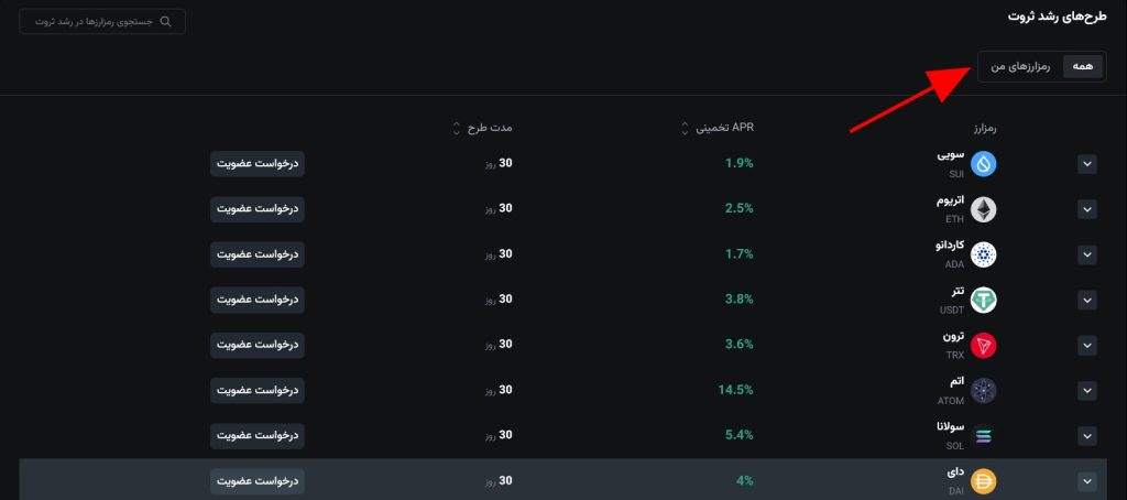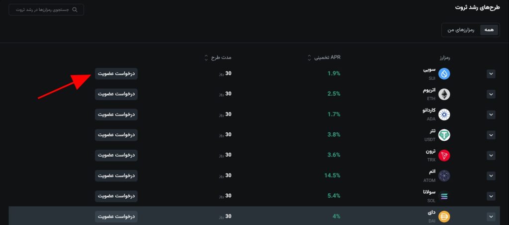 فهرست رمزارزها را مشاهده میکنید. درکنار هر رمزارز، APR یا همان سود سالانه تخمینی، مدت طرح و دکمه درخواست عضویت وجود دارد. آنها را بررسی کنید و برای شرکت در طرح موردنظرتان، دکمه درخواست عضویت را بزنید: