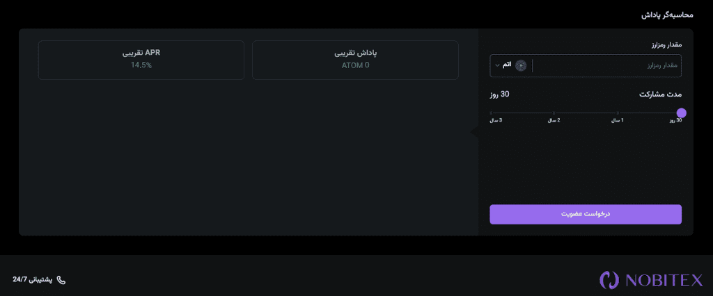 در انتهای صفحه، محاسبهگر پاداش را مشاهده میکنید. کافی است رمزارز مدنظرتان را انتخاب و مقدار آن را مشخص کنید. باتوجهبه مدت مشارکت که میتواند بین ۳۰ روز تا ۳ سال باشد، پاداشتان محاسبه و به شما نشان داده میشود. نرخ پاداش در طول زمان بسته به شرایط بازار ممکن است تغییر کند. محاسبهگر پاداش را در تصویر زیر مشاهده میکنید: