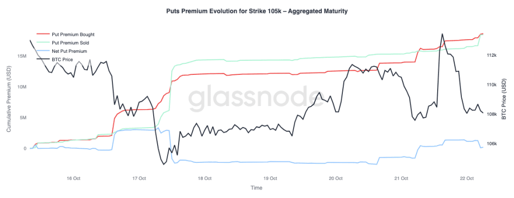 از طرف دیگر، در قراردادهای پوت با قیمت اعمال ۱۰۵,۰۰۰ دلار الگوی معکوس دیده میشود و این فرضیهی ما را تایید میکند. با افزایش قیمت بیت کوین، پریمیوم خالص پوتهای ۱۰۵,۰۰۰ دلار نیز افزایش یافت. این یعنی معاملهگران بیشتر تمایل داشتند برای محافظت در برابر کاهش قیمت هزینه کنند تا اینکه بخواهند از رشد قیمت سود کسب کنند. به بیان دیگر، واکنش معاملهگران آپشن به رالی اخیر بیت کوین پوشش ریسک و محافظت بود، نه اطمینان و باور به ادامه رشد آن.