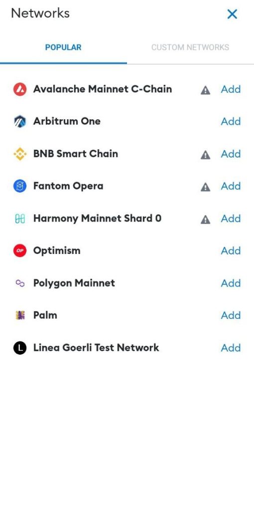 در تب Popular لیستی از شبکههای محبوب را مشاهده میکنید که با زدن گزینه Add و در ادامه زدن گزینه Approve شبکه مورد نظر به کیف پول شما اضافه میشود. شبکههای محبوب عبارتاند از: